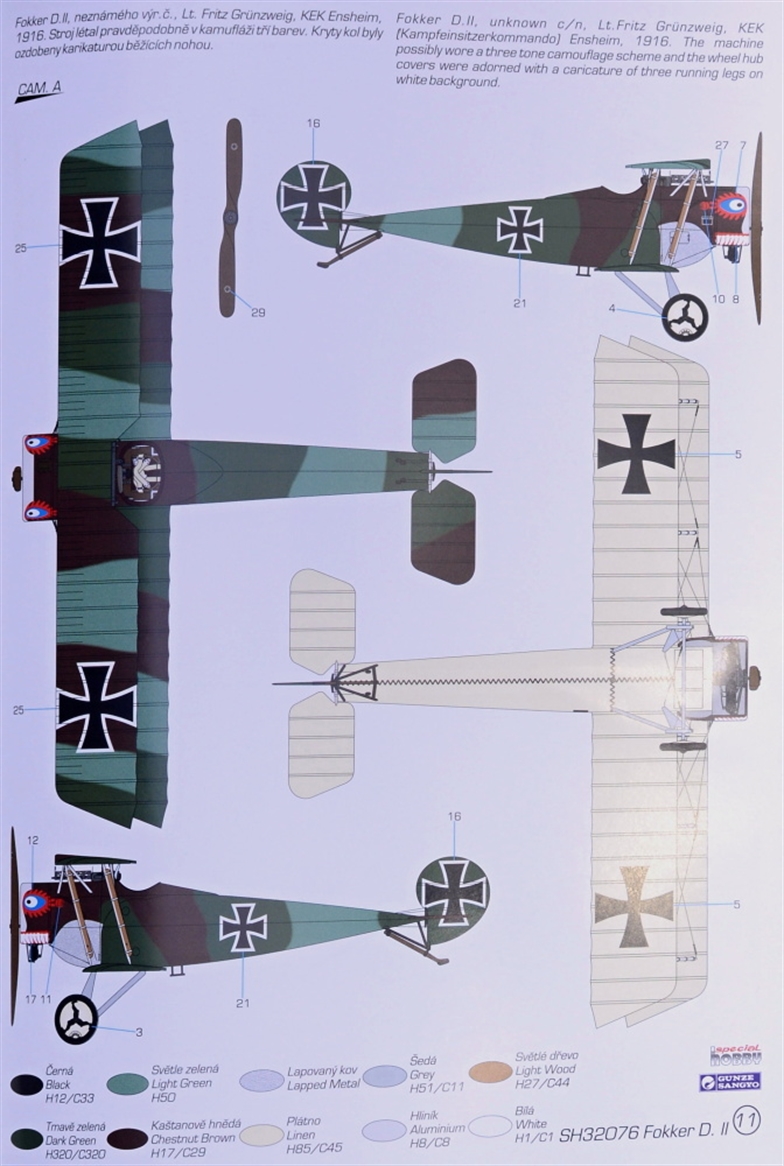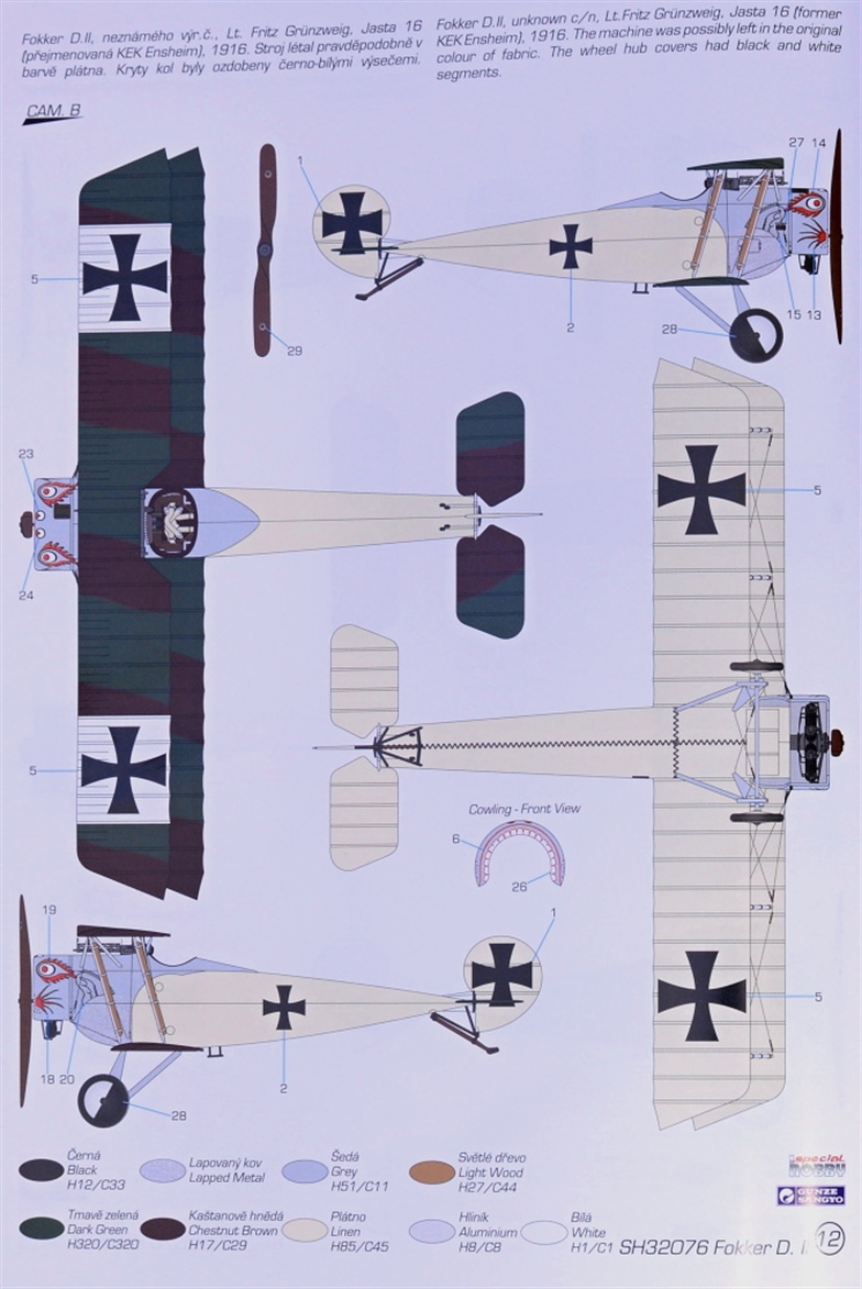 The kit contains three styrene sprues, two of them in short run standard, the third one is produced using metal moulds and brings the smallest items of the kit. A photo etched set and a windshield pre-printed on a piece of clear film are also offered in the kit. The decal sheet caters for two machines, both of which were flown by Lt.Fritz Grünzweig, a fighter pilot also renowned as an excellent painter, cartoonist and a buffoon. His machines were adorned with elaborated mouths and eyes on the cowlings and thus belonged to the most eye-catching of all Fokker D.IIs