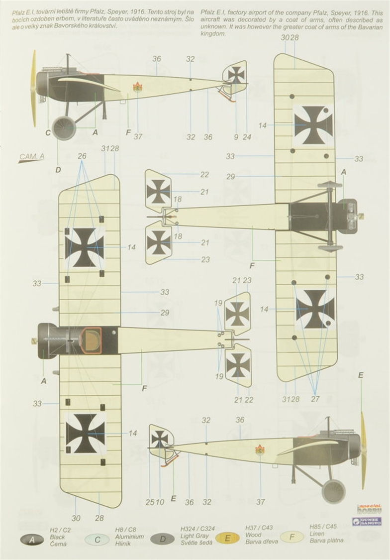 Special Hobby - 1/48 Pfalz E.I Pfalz Flugzeugwerke GmbH was established in Speyer in the then Kingdom of Bavaria in 1913 by Alfred Eversbusch, his brother Ernst and several other investors. The first types to be produced by the new company were licence-built Otto biplanes, but production rights for Morane Saulnier monoplanes were bought before the Great War, namely the Type L parasol-wing two-seat monoplane and Type H mid wing single seater. The latter was built as the Pfalz E.I, fitted with an 80HP Oberursel U0 engine. These aircraft were, in the first place, delivered to Bavarian units. At first without armament and were used as fast scout planes, later after being equipped with machine gun armament with synchronization gear, they became, along with the Fokker E.I, the first true fighter planes of the German military. The armament of one Lmg 08/15 machine gun was mounted on the right side of the front fuselage and the machines were used to escort and protect reconnaissance aircraft both on the Eastern and Western Front and smaller number of them also saw service in Palestina. The greatest number of the Pfalz fighter plane was used operationally during April 1916, later their numbers decreased and the Pfalz E.I were either replaced by a more modern E.I type or by much more successful Fokker E.II and E.III fighter planes.