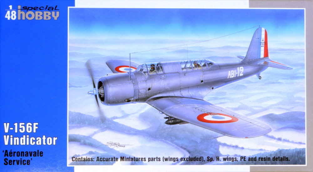 Special Hobby - 1/48 V-156F Vindicator A?ronavale Service In the effort to get modern military aircraft, France bought larger numbers of US machines in 1939. Among them also the V-156 Vindicator dive bombers. The French version was designated the V-156F and differed significantly from the US machines-it was not fitted with the arrestor hook below the fuselage and instead carried air brakes in the wings. The V-156Fs also got French armament machine guns, and underwing racks and bombs. Even though they were tested on board of the B?arn carrier, France operated them from land bases only. All of them were eventually destroyed during the Battle of France in 1940.