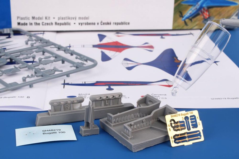 Special Hobby - 1/48 Bugatti 100 Racer In the pre-war years, Ettore Bugatti, a very well known racing car designer, took the opportunity and decided to turn his attention to aviation too and come with a concept of a racing aeroplane which was to win the then rather popular Deutsch de la Muerthe races. At first, the plane was to be fitted with just one engine, this was later reconsidered and two powerplants were used, placed asymmetricaly in the sleek fuselage, each one driving its propeller-these were two, counterrotating. In this shape, the plane was even supposed to break the world speed record. The aeroplane was finished and prepared just before the war broke out, but had to be put out of the sight of the advancing German army. As of now, the Bugatti prototype is placed on display at the Eaa Aviation Museum in the USA.