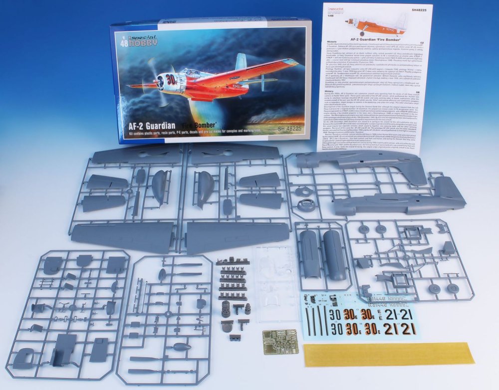 Special Hobby - 1/48 Grumman AF-2 Guardian 'Fire Bomber', The largest single engine, piston engine aircraft to have ever been flown from the decks of aircraft carriers-yes this is the apt description of the anti-submarine AF-2 Guardian aeroplane. Following the Korea War, the Guardians were redelegated to reserve units and eventually struck off charge. Some of them, however, and mainly due to the strength of their airframe and their excellent range and payload capability, were given a new lease of life and converted to fire fighting machines which kept flying well until the 1970s.