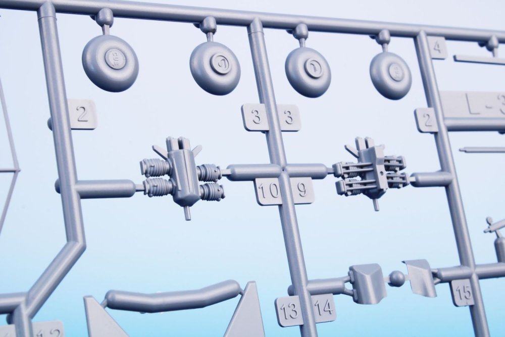 The kit comes on two grey styrene sprues, one with clear parts, a photo etched fret and a sheet of decals with markings for the four schemes.