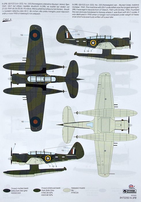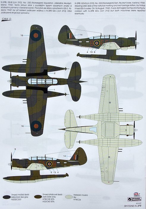 Special Hobby - 1/72 Northrop N-3PB 'No. 330 (Norwegian) Squadron RAF'. The N-3PB were being operated by No.330 (Norwegian) squadron based on Iceland for a quite long period of time. Initialy, the planes flew with the early Raf type of roundels and with fuselage numbers instead of squadron codes which were incorporated later on. During 1942, a new type of Raf markings was introduced and replaced the older ones also on the N-3PB airframes and the colour of the fuselage codes was changed as well. The decal sheet covers all the above options and caters for three machines, one with the initial markings and numbers on the fuselage and the other two with the fuselage code letters in two different colours and wearing the early and also the later style of the Raf roundels.