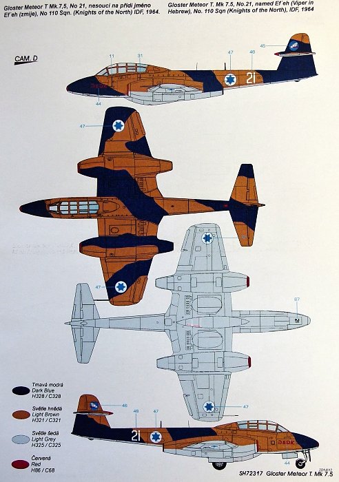 Special Hobby - 1/72 Gloster Meteor T Mk 7.5 1/72Gloster T Mk.7 trainer aircraft (available under no.72548) was one of the most widespread variants of the Meteor jet fighter aircraft. Only a handful of the Meteor T Mk.7 was equipped with a larger and squared off tail taken from the more modern Mk 8 fighter version. This new trainer variant got some what peculiar designation Meteor T Mk 7.5 (T Mk 7 ? was also used). While these planes were used in Great Britain mainly for various test flights and public shows, in the Belgian and Israeli air forces they served as standard training machines.The kit contains five frames of plastic parts, three of them in standard greyish styrene, the other two which contain the canopy and recce nose parts are made of clear plastic. The decal sheet offers markings for the Gloster company demonstration aircraft which was blue overall with white coloured stripes and civil registration codes. It was also equipped with non-standard wing-tip fuel tanks. The other British aircraft in this kit is the RAE test machine in dark blue overall and with a non-standard reconnaissance nose. This pair is accompanied by a silver Belgian machine with yellow trimmings and a camouflaged Israeli plane wearing a name on its nose (Ef´eh, ie Viper).[ ] More...