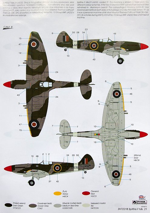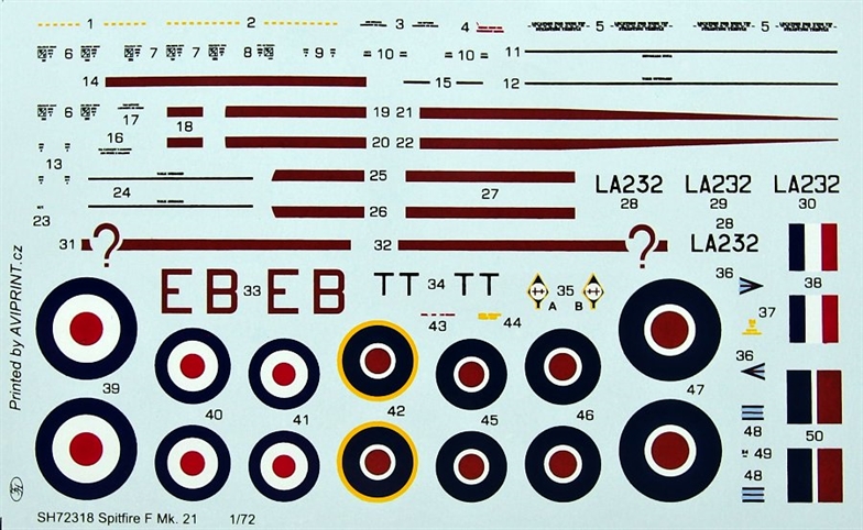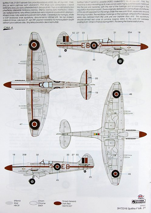 In the box containing a model of this beautiful aircraft you will find four sprues with highly detailed plastic parts, a set of clear parts and a decal sheet. We have indeed gone an extra mile with the construction of this replica, in the sprue with small parts you?ll get fish-tail exhausts for a war-time Spitfire Mk.21 as well and the rounded-type of exhaust for the post-war machines. There are of course also both three and four-spoked wheels included. The decal sheet offers markings for highly interesting No.41sqn machine that was originally delivered in a standard camouflage but later was repainted with Aluminium colour. While the fuselage and tailplanes were overpainted very carefully, the main wing wore visible streaks of aluminium colour. The original camouflage was also still visible around the top wing roundels. The fuselage, wing and also the tailplanes were adorned with red stripe markings which referred to the squadrons red cross of Lorraine insignia. The other machine served as a personal machine of two Raf senior officers. At first it flew with a camouflage and unarmed, later was repainted in standard post-war Aluminium. At the controls of the camouflaged Spitfire was Air Vice Marschal Thomas Cathcart Traill CB, OBE, Dfc (8 victories during WW1), Co of No.12 Group RAF. Later, while the machine wore the aluminium coat, it was flown by an unknown Group Captain as suggested by the pennants on the fuselage sides. There is a resin set of various aerodynamical fairings covering the cannon stubs in the model which are intended for this machine. The decal sheet of course contains large amount of stencils.