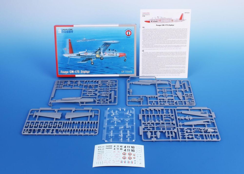Special Hobby - 1/72 Fouga CM-175 Zephyr The Fouga Magister was among the most wide-spread jet trainers of the World. However, its navalized version known as the Fouga Zéphyr was used only by the French Aéronavale. This version sported a strenghtened structure, naval equipment, different nose section and rear sliding canopies. Aboard French aircraft carriers and at the land bases it served successfully for long 35 years. The kit which comes in a box with a brilliant box-art of a Zephyr during a landing and it contains in total four plastic sprues and one sprue of clear parts. The decals offer an early machine and three with the later type of marking of the Aeronavale.