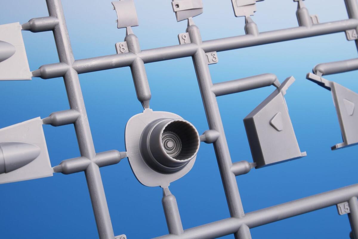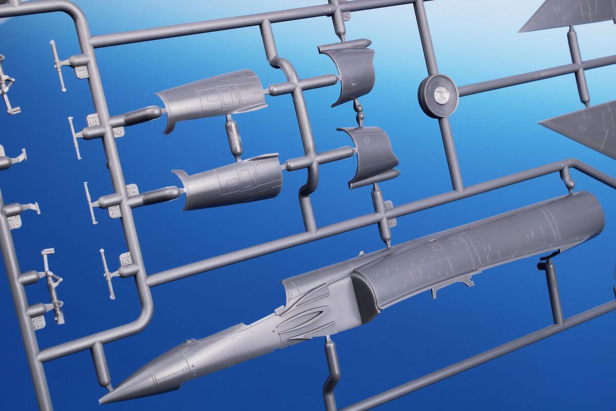 As many as seven styrene sprues plus one with clear parts in the kit are joined by a decal sheet with markings for four Iaf machines with the earlier powerplant, the Atar 9B jet engine.