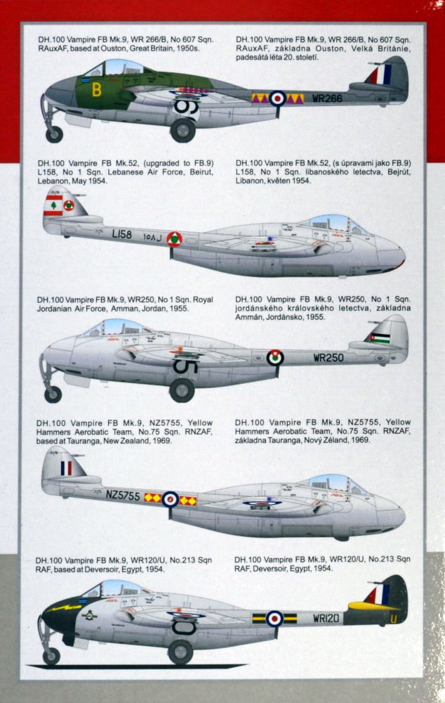 Special Hobby - 1/72 De Havilland DH.100 Vampire FB.Mk.9 'Tropicalised Fighter-Bomber' Sometimes this autumn, Special Hobby will be releasing two new 1/72 Vampire reboxings. Along with the 'long-winged' Mk.3 Vampire, you will be also tempted by a version we have not released before, the tropicalised, fighter bomber FB Mk.9 Vampire. As you will have guessed from the name, these Vampires had been fitted with an air-con unit in a special housing on the starboard side of the fuselage nacelle, just front of the air intake, which made them suitable for service in hot areas. The boxart below is another Cgi masterpiece by M.Reinis.