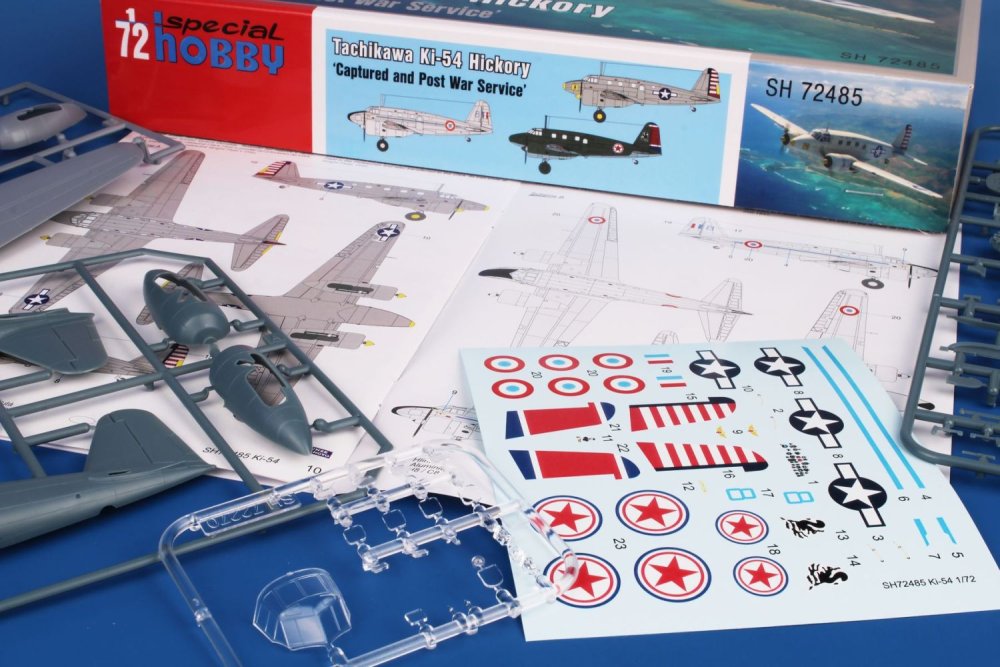 Special Hobby - 1/72 Tachikawa Ki-54 Hickory 'Captured and Post War Service' The Hickory was a Japanese WW2 twin-engined aircraft produced in four versions, for pilots, wireless operators and navigators training, gunnery training, a transport verison and anti-submarine operations type. Our kit comes on four styrene sprues and one with clear injected parts.