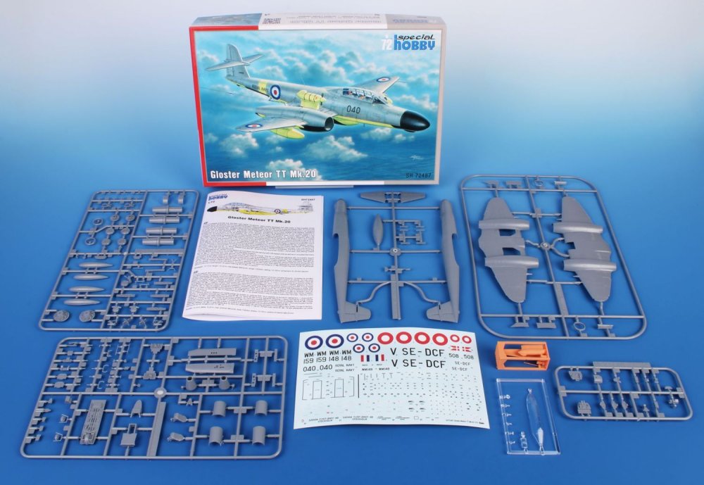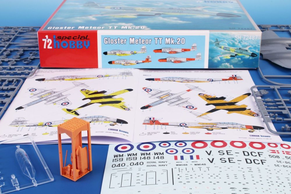 Special Hobby - 1/72 Gloster Meteor Tt Mk.20. As the Raf Gloster Meteor Mk.11 jets began to leave the first line duty, it was necessary to find a new job for them. A few of the Mk.11 airframes were converted to a target tug to requirements issued by both the Royal Navy and RAF. These were designated Tt Mk.20 and in a similar fashion were also rebuilt Meteor Mk.11s of the Danish Air Force and a Swedish civil operator. Our Meteor Tt Mk.20 comes on five styrene sprues, one with clear parts and also contains a set of conversion parts of the target tug equipment. The decals cater for two British airframes, one from Denmark and one as flown in Sweden.