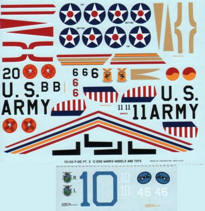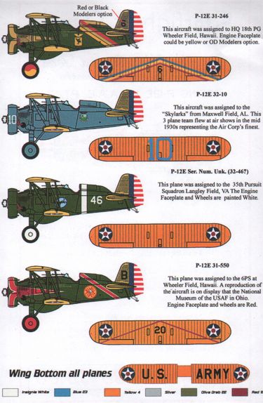 Starfighter Decals - 1/72 Boeing P-12E Usaac Part 2 (4) 31-246 Hq 18th Pg HawaII, 32-10 The Skylarks, Maxwell Field AL, 32-46 35th Ps Langley Field, 31-550/B 6PS HawaII. Very colourful.