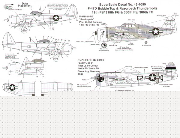Microscale - 1/48 Republic P-47D Thunderbolt (2) 'Razorback' 43-25478/E 19 FS/318 Fg Lt Hal Dunning 'Smokepole', 44-20089 C2-Q 396 FS/386 Fg Lt Irv Ostuw 'Leaky Joe 5'.