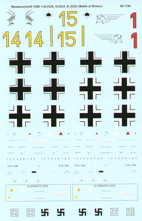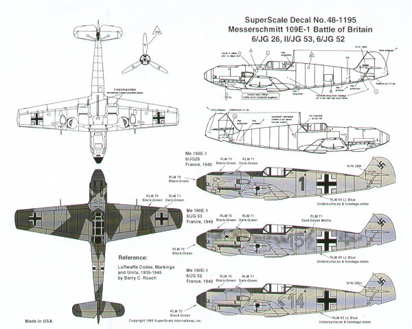 Microscale - 1/48 Messerschmitt Bf-109E-1 Battle of Britain (3) Red 1 6/JG 26, Yellow 15 II/JG 53, Yellow 14 6/JG 52 All Rlm 70/71/65