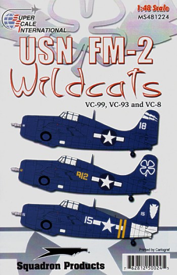 Superscale - 1/48 General-Motors FM-2 Wildcats VC-8, VC-93 and VC-99 Decals for 3 overall Sea Blue U.S. Navy General-Motors FM-2 aircraft: 'White 18', VC-99 off the Uss Hoggatt Bay (CVE-75), 1945, 'Yellow B12', VC-93 off the Uss Petrof Bay (CVE-80), 1945 and 'White 15', VC-8 off the Uss Nehenta Bay (CVE-74), 1945. Includes stencils and placement guide, (for Hobby Boss kits HB80330)