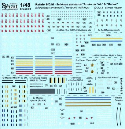 Syhart - 1/48 Armements Dassault Rafale B/C/M Armements Dassault Rafale B/C/M Note: This decals sheet is already included in the set Syhart 48/72-915 Dassault Rafale B/C/M marquages standards "Armée de l'Air" & "Marine" This decals set included all markings for weapons, and pod used by Dassault Rafales in the Armée de l'Air (French air force), and the Marine (French Navy). As several of this devices are used by others aircrafts (like mirage 2000D, Super-Etandard...), that this sheet is available here separately from the original set and also inside Syhart 48/72-915 Dassault Rafale B/C/M marquages standards "Armée de l'Air" & "Marine".