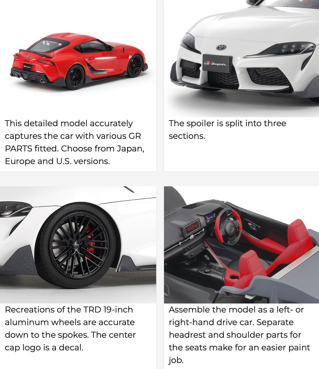 Tamiya - 1/24 Toyota Gr Supra Custom. The Gr Supra is a Toyota two-seater sports car released in January 2019, whose sensuous long nose, short deck form has a striking double-bubble roof. The top grade Rz model has a 340hp inline-six turbo engine. Plenty of custom parts called Gr Parts are offered by Trd Toyota Racing Development for various customizations. Components such as carbon fiber aerodynamic parts, forged aluminum wheels and sports muffler provide superior performance. Owners can enjoy customizing this car as they like to get their ideal drive.