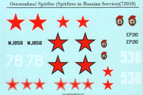 Tigerhead Decals - 1/72 Supermarine Spitfires in Russian Service. Along with British Hurricanes, the Soviet Air Force (voyenno-vozdushnyye sily--VVS) also managed to fly another aircraft of the Royal Air Force as a front-line fighter--the Spitfire Mk. Vb. In the West this airplane is feted as the winner of the Battle of Britain, and is also a national symbol of World War II. In the skies of Russia these fighters became participants in 1943 of the bloodiest battles over the Kuban. Two front-line fighter aviation regiments of the Soviet VVS--57th Guards Fighter Aviation Regiment (GIAP) and 821st Fighter Aviation Regiment (IAP)--were re-equipped with the Spitfire Mk. Vb. It was the 57th GIAP that first entered combat with the enemy in these fighters, in May 1943. Earlier the regiment was known as the 36th IAP, and was formed in Baku in 1938. Pilots flew the regiment's first combat sortie under the command of Major Aleksandr Alekseevich Osipov on 27 November 1941 as part of the 72d Fighter Aviation Division (IAD) (later the regiment was subordinated to the 237th IAD). The regiment fought in the Southern, Crimean, and North Caucasus fronts until 15 November 1942. It is possible to make 3 full profiles. - Spitfire Mk.Vb 57 GIAP Kuban 1943 - Spitfire Mk.IXe 26 GIAP Leningrad 1944-1945 - Spitfire Mk.IXc MJ858