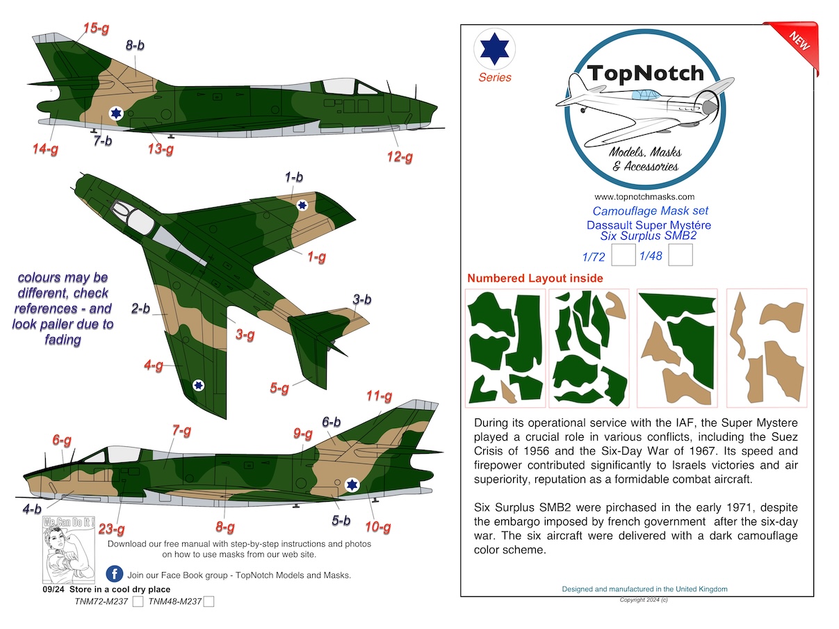 Top Notch - 1/48 Dassault Super Mystere SMB2 1971 3 colour 'Brown/Drk Green/Lt Green' camouflage pattern paint masks