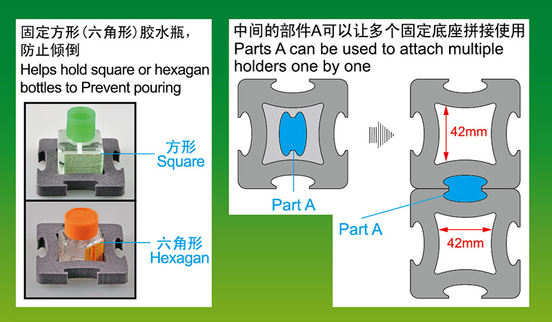 Keep tinlets and bottles in position on the bench while brushing paint or adhesive onto the model in progress. Holders can be linked together.