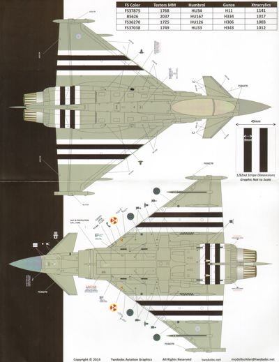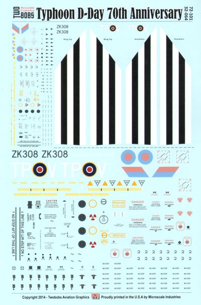Two Bobs - 1/32/1/72 Eurofighter EF-2000A Typhoon. To commemorate the 70th Anniversary of the Normandy Invasion, the Royal Air Force adorned an aircraft from RAF Coningsby, Lincolnshire with D-Day invasion stripes in 2014. This aircraft is making its way through the European airshow circuit and pays homage to the crews of the WWII era Hawker Typhoon. This sheet has both 1:32 and 1:72 markings on. TB72101.