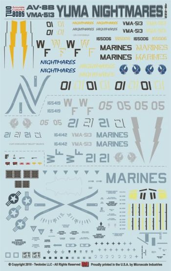 Two Bobs - 1/48 McDonnell-Douglas AV-8B Harrier Yuma Nightmares. The first sheet in decal form that captures the new gunship gray scheme that all Usmc Harrier aircraft are painted in now. There are options for three different A/C on this sheet and enough stencils for one complete aircraft. Bonus stencils for the chaff/flare dispensers as well as the Litening At pod are included. Both the Night Attack and Harrier II Plus jets from VMA-513 are on this sheet.