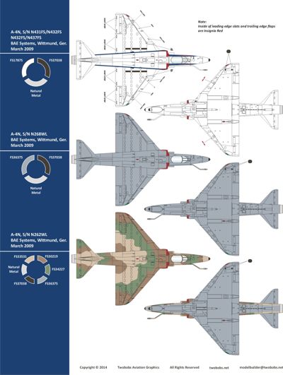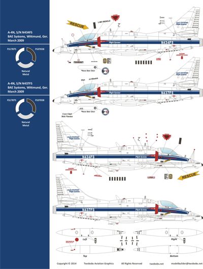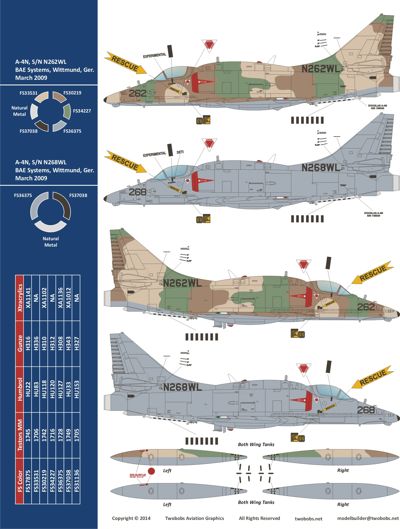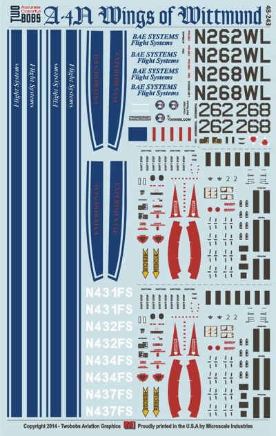Two Bobs - 1/48 BAE Systems operates (6) ex-Israeli Air Force Douglas A-4N Skyhawk aircraft in Wittmund, Germany. These aircraft fly tow banner, Ground Control Intercept and Close Air Support training missions in support of NATO in Europe. This sheet contains accurate markings to include all stencils and crew names. There are enough markings to build (2) complete Blue/White aircraft as well as both camo jets. Sized for the Hasegawa A-4N Kit. (E/F kit require the Quickboost tail nozzle extension) Recommended Kits: Hasegawa A-4N