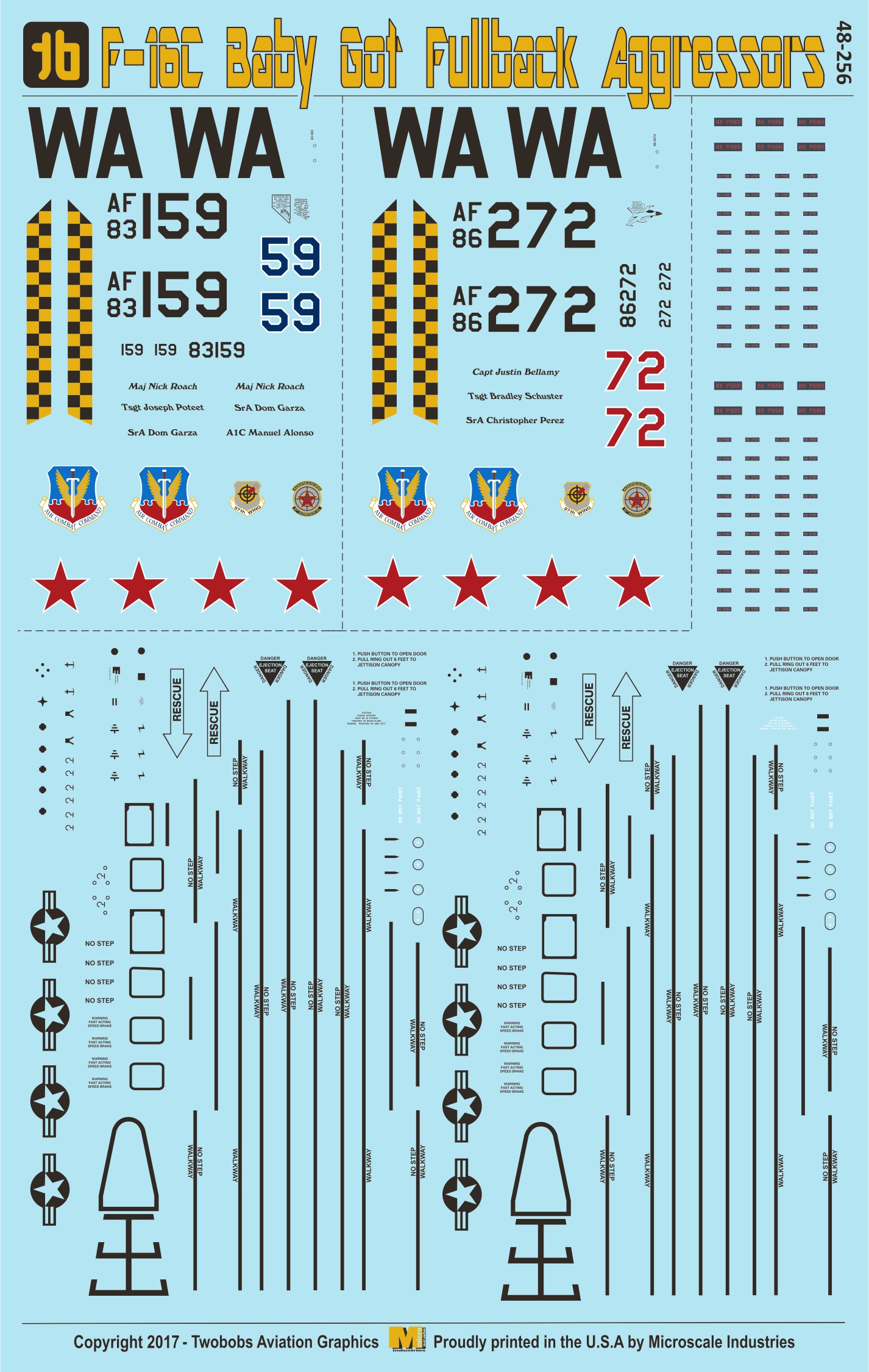 Two Bobs - 1/48 Lockheed-Martin F-16C Fighting Falcon 'Baby Got Fullback' Aggressors. The new Shark Aggressor scheme along with the 2nd splinter jet. There are also vinyl masks attached per the images for the Shark schemes false dielectric antennas. The 57th Wing at Nellis AFB continues to generate new adversary paint schemes that mimic the newest schemes from potential adversaries of the US, Splinter and Shark are the two newest.