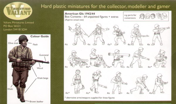 Valiant Miniatures - 1/72 American G I's 1943/44. Following Americas sudden entry into the war at the end of 1941 the army underwent a massive expansion and re equipment programme. The models in this box depict the troops deployed in the North African, Mediterranean and European theatres from Operation Torch in 1942 to the autumn of 1944 in Nw Europe. They are wearing the typical combat uniform which includes the M1941 field jacket and canvas leggings.