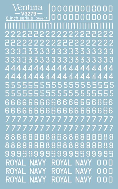 Ventura - 1/32 RAF and RAAF 8" serial letters and numbers. WHITE in 1/32nd scale. Also used as as 12 inch in 1/48th and 18 inch in 1/72nd scale. Each package includes three 125mm x 200mm sheets.