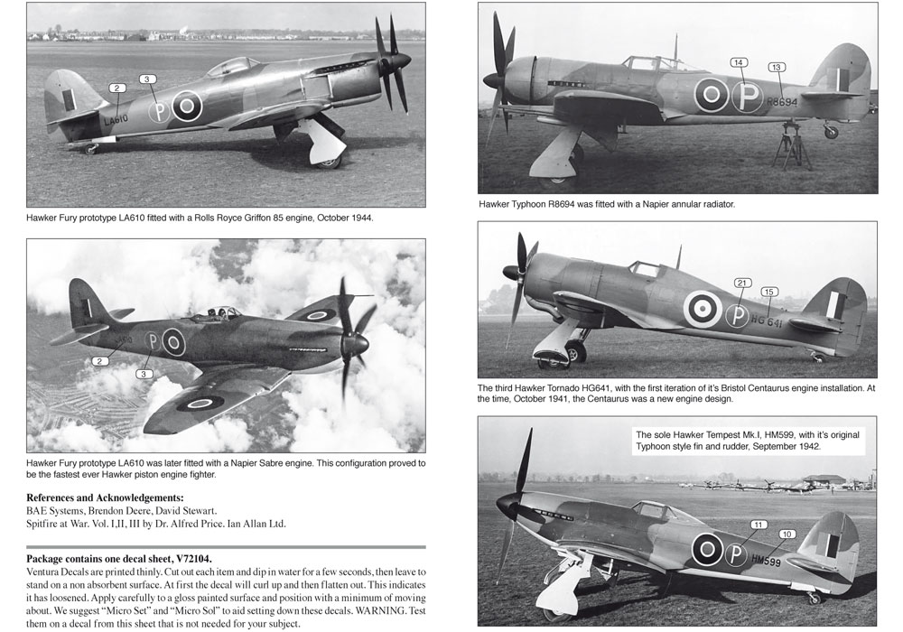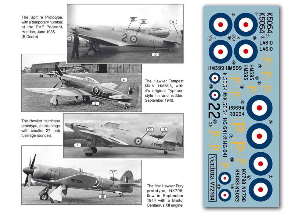 Ventura - 1/72 British Prototypes. Supermarine Spitfire, Hawker Hurricane, Typhoon, Tornado, Tempest, Sea Fury. Roundels included for Spitfire and Hurricane.