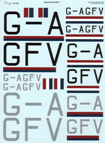 Vingtor Decals - 1/48 De Havilland Mosquito Mk.IV British Overseas Airways Corporation G-AGFV in choice of 3 schemes. Dk.Green/Dk.Earth/Silver, Dk.Earth/Dk.Green/Sky, Extra Dk.Sea Grey/Dk.Slate Grey/Night Black.