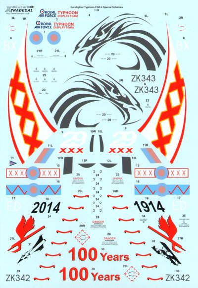 Xtradecal - 1/32 BAe Eurofighter Typhoon FGR.4 (2) ZK342/ED Wg.Cdr. Mike Baulkwill 6 Sqn 2014 Display Aircraft with desert camo on fin and spine RAF Lossiemouth, ZK343/BX Flt.Lt. Noel Rees 29 Sqn Display aircraft with black fin RAF Coningsby.