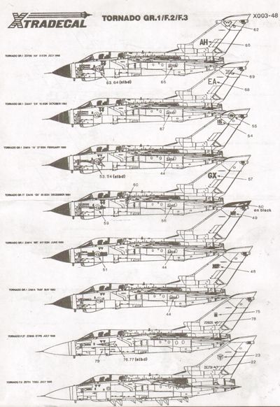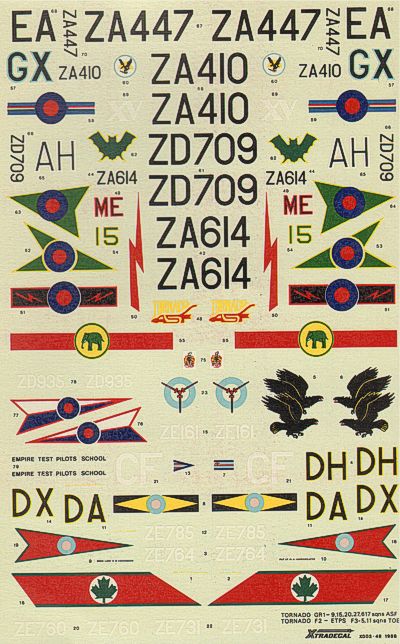 Xtradecal - 1/48 Panavia Tornado GR.1/F.2/F.3 (12) GR.1 9 Sqn ZD709/AH, 15 Sqn ZA447/EA, 20 Sqn ZA410/GX, 27 Sqn ZA614/15, 617 Sqn ZA614/ME, Tasf ZA614, F2 Etps ZD935, F3 Toeu ZE731, 5 Sqn ZE760/CF, 11 Sqn ZE161/DX, ZE785/DA, ZE764/DH