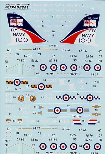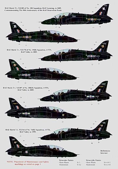 Xtradecal - 1/48 BAe Hawk T.1 (5) XX301 plus rest of Fradu fleet 100 Years of Naval Aviation 2009 Rnas Yeovilton, XX316 74(R) Sqn with small Tiger's Head on fin 1999, XX178 19(R) Sqn 2009, XX307 208(R) Sqn 2009, All Raf Valley. XX289/CO 100 Sqn Commemorating the 90th Anniversary of the Raf Benevolent Fund Raf Leeming 2009. All in overall black scheme.
