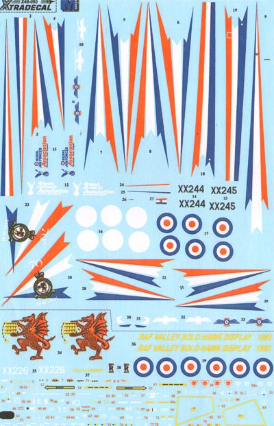 Xtradecal - 1/48 BAe Hawk T.1A (2) XX244 or XX245 208(R) Squadron, 4 Fts Raf Valley 2011 Display Aircraft flown by Flt.Lt. Jules Fleming, XX226 4FTS Raf Valley 1993 Display Aircraft with Valley Dragon logo on fin.