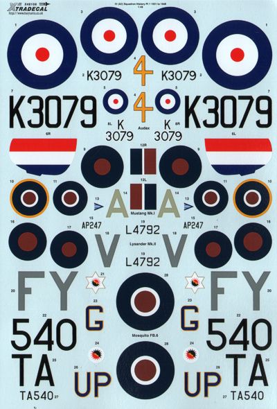 Xtradecal - 1/48 RFC/RAF 100 Years of 4 Squadron Pt 1 (4) Hawker Audax K3079/4 Raf Farnborough 1931, Westland Lysander Mk.II L4792 FY-V Raf Odiham 1939, North-American Mustang Mk.I AP247/A Raf Twinwood Farm 1942, de Havilland Mosquito FB.6 TA540 UP-G Raf Wahn 1948,