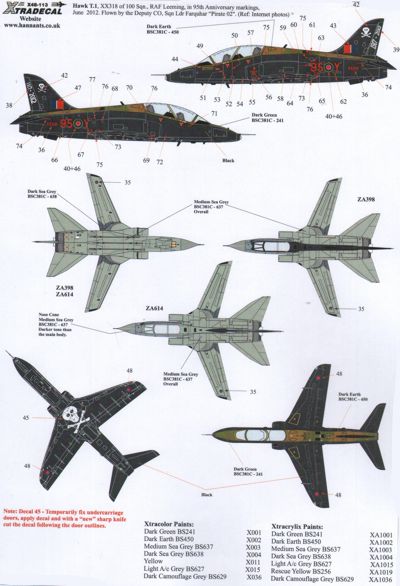 Xtradecal - 1/48 RAF Anniversary Update 2011/12 - 100th Anniversary of 2 Sqn Tornado GR.4 ZA398 RAF Marham; 95th Anniversary 100 Sqn Hawk T.1 95-Y XX246 or XX318 with large skull and cross bones under fuselage and dark green/dark earth spine RAF Linton-on-Ouse; 41 Sqn Tornado GR.4 ZA614 'Group Capt Don Finlay' Squadron CO during B of B and medal winner in 100 Metre Hurdles at 1932 and 1936 Olympics;