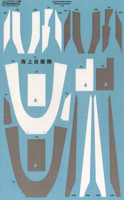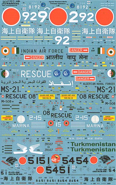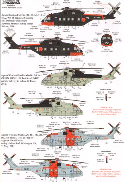 Xtradecal - 1/48 Agusta/Westland Merlin (8) CH-101 Mk.518 8192 '92' Japanese Maritime Self-Defence Force aboard Antarctic survey vessel 2010 overall FS26076 Engine Grey with orange trim; AW-101 Mk.641 ZR342 UK Test Serial IND05 prior to delivery to Indian AF 2012; AW-101 Mk.610 ZR331 MS-21 due for Algerian Naval Forces during trials at RAF St.Mawgan 2011 overall Med Sea Grey; EH-101 Mk.512 M-508 'Rescue 08' ESK 722 R. Danish AF Karup 2009; EH-101 Mk.410 MM81494 2-15 Italian Navy La Spezia-Luni 2010 overall FS36375; AW-101 (VVIP) Mk 643 ZR337 Turkmenistan Airlines 2013 overall white; MCH-101 Mk.518 8651 '51' or 8654 '54' both 111 Kokutai Japanese Maritime Self-Defence Force, Iwakuni 2010 both Lt Gull Grey over white. Basic kit will need modification to window layout for all of these aircraft.