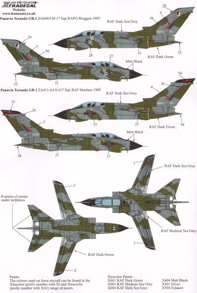Xtradecal - 1/48Panavia Tornado GR.1/GR.1A Pt.1 (6) ZA373/H 2 Sqn RAF Marham 1990, ZD714/BE 14 Sqn RAFG Bruggen 1985, ZA448/EB 15 Sqn RAFG Laarbruch 1984, ZA470/FL 16 Sqn RAFG Laarbruch 1984, ZA600/CM 17 Sqn RAFG Bruggen 1985, ZA411 AJ-S 617 Sqn RAF Marham 1989. All overall green/dk sea grey camo.