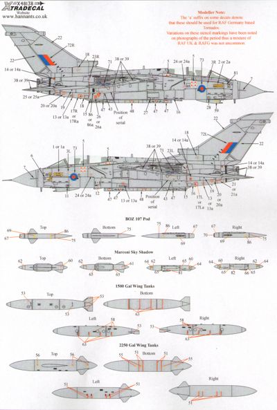 Xtradecal - 1/48 Panavia Tornado Stencil Data. Complete stencil data for 2 UK and RAF Germany (RAFG) (1 each)based aircraft including underwing stores and uppersurface walkways. 2 full size decal sheets.