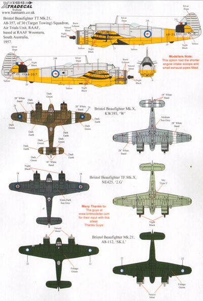 Xtradecal - 1/48 Bristol Beaufighter Mk.X, TF Mk.X, Mk.21, TT Mk.21 (5) Due Mid May. Mk.X KW393/W 27 Sqn Burma 1945, =TF Mk.X LZ451 EE-M 404 Sqn RCAF Wg/Co Alfred Kitchener Gatward DSO D-Day stripes RAF Strubby 1945, = NE425 2-G 404 Sqn RCAF RAF Davidstow Moor, Cornwall 1945, Mk.21 A8-112 SK-L 93 Sqn RAAF Morotai Island, Borneo 1945 TT Mk.21 A8-357 30 (TT) Sqn Air Trials Unit RAAF Woomera 1957,