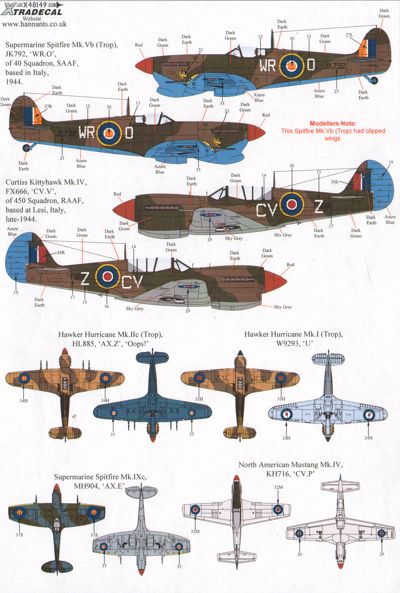 Xtradecal - 1/48 Fighters over North Africa and the Mediterranean Pt.1 (6) Hawker Hurricane Mk.IIc Tropical version HJ885 AX-Z 'Oops' 1 Sqn SAAF 258 Wing based LG.128 1942, Hurricane Mk.I Trop W9293/U 73 Sqn Nth Africa 1942, Supermarine Spitfire Mk.Vb Trop JK792 60 Sqn SAAF Italy 1944, Spitfire Mk.IXc MH904 AX-E 1 Sqn SAAF Italy 1944, North-American P-51D Mustang Mk.IV KH716 CV-P 3 Sqn RAAF Italy 1945, Curtiss P-40 Kittyhawk Mk.IV FX666 CV-Z 450 Sqn Lesi, Italy 1944.