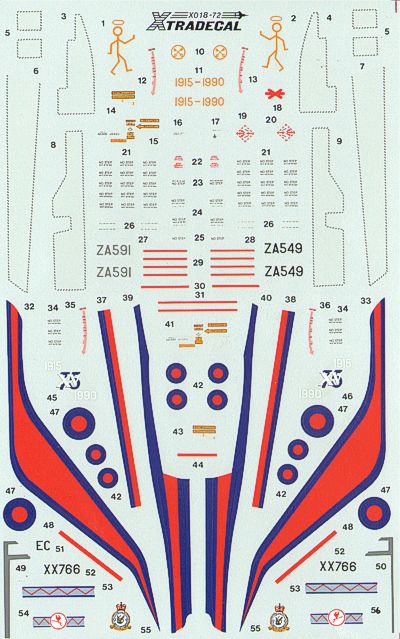 Xtradecal - 1/72 Raf Update 1990 Part1 (3) Panavia Tornado GR.1 ZA591 16 Sqn 75th Anniversary black aircraft with large 'Saint' on fin, ZA549 15 Sqn 75th Anniversary with blue and red fin, fuselage and wing stripes, Sepecat Jaguar GR.1 XX766 6 Sqn with large Squadron badge on fin