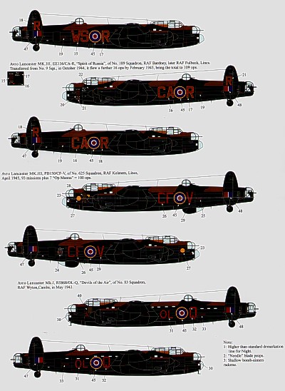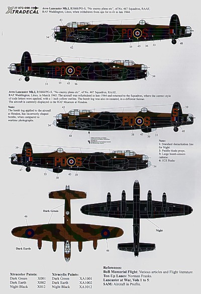 Xtradecal - 1/72 Avro Lancaster B.I/III. Ton-Up Avro Lancaster s (6) PA4474 HW-R/BQ-B Battle of Britain Memorial Flight 2008 `Phantom of the Ruhr', EE139 HW-R 100 Sqn `Phantom of the Ruhr' Raf Waltham 31 missions then transferred as BQ-B to 550 Sqn Raf North Killingholme to complete 121 missions, EE136 WS-R 9 Sqn Raf Bardney `Spirit of Russia' 93 missions then transferred as CA-R to 189 Sqn Raf Fulbeck to complete 109 missions, PB150 CF-V 625 Sqn Raf Kelstern 93 missions plus 7 `Op Manna' to total 100.