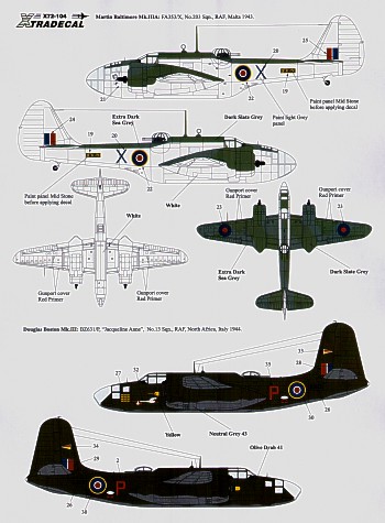 Xtradecal - 1/72 . Mediterranean Twins (7) Bristol Beaufighter Mk.If X7760/Y 46 Sqn North Africa 1942, Bristol Beaufighter Mk.X NV115/D `Pamalamay A Flt 16 Sqn SAAF Italy 1945, Martin Baltimore Mk.IIIA FA353/X 203 Sqn Malta 1943, Douglas Boston Mk.III BZ631/P 13 Sqn `Jacqueline Anne' Italy 1944, Marauder Mk.II FB484/V 12 Sqn `Viking' SAAF Italy 1944-5, Marauder Mk.III HD625/R 39 Sqn Balkans, Vickers Wellington Mk.X HE687 QB-T 424 (Canadian) Sqn `Terror of Axis Nightlife'. (Martin B-26, Douglas A-20)