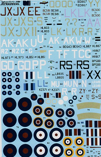 Xtradecal - 1/72 Hawker Hurricane Mk.IIc (18) BE500 LK-A 87 Sqn 1942, BE581 JX-E 1 Sqn Flt.Lt K. M. Kuttlewascher , BD936 ZY-S 247 Sqn Exeter 1942. Overall black, BE581 JX-E 1 Sqn. HL864 LK- 87 Sqn 1942, HL865 LK-R 87 Sqn Green/Ocean Grey top, black undersurfaces, BD867 QO-Y 3 Sqn Martlesham Heath 1941, BN964 JX-S 1 Sqn 1942, HL603 JX-I 1 Sqn 1942. All Day Fighter camouflage BE543 AK-U 213 Sqn P/O Bert Houle Western Desert 1942, HL887 AK-W 213 Sqn 1942, HV817 FT-C 43 Sqn Algeria 1942, HL851 GO-P 94 Sqn `The MacRobert Fighter-Sir Iain' Egypt 1942, HL973 RZ-G 241 Sqn 1943, BP588 RS-X 33 Sqn S/Ldr S.C.Norris Co 1942. All North Africa camouflage Dk Earth/Mid Stone/Azure Blue. LB935/L 34Sqn or 4 Sqn Indian AF, KZ371/R 1 Sqn Indian AF. Both Day Fighter camouflage with Seac roundels. LD349 MU-N 60 Sqn Burma 1945 Dk Green/Dk Earth/Med Sea Grey.
