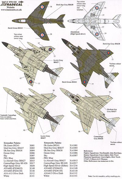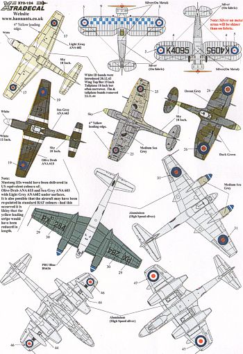Xtradecal - 1/72 History of Raf 19 Sqn 1935 91 (8) Gloster Gauntlet Mk.I K4095 Duxford 1935, North-American P-51B Mustang III FZ164 QV-V 'Wilf' Flt.Lt. T.H.Drinkwater Raf Gravesend 1944, Supermarine Spitfire Mk.XVIe TE470 QV-B Raf Biggin Hill 1946, de Havilland Hornet F.1 PX284/H Raf Linton-0n-Ouse 1946, Gloster Meteor F.8 WE863 Coronation Review Raf Odiham 1953, Hawker Hunter F.6 XG152/X Raf Church Fenton 1958, McDonnell-Douglas FGR.2 Phantom XV474/F Raf Wildenrath at Jubilee Review Raf Finningley 1977 green/grey camouflage, McDonnell-Douglas FGR.2 Phantom XV419/AA Raf Wildenrath 1991 Camouflaged Grey with Blue fin.