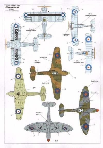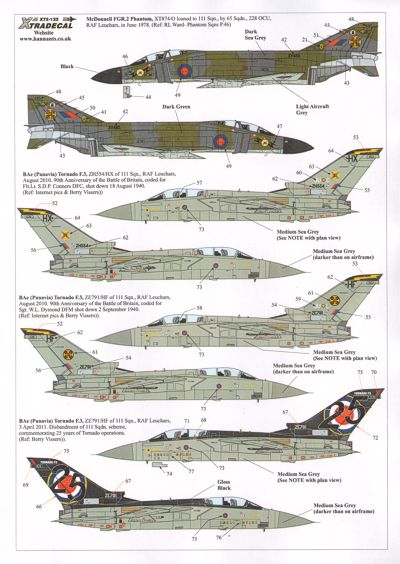 Xtradecal - 1/72 Raf 111 Squadron History 1918 2011 (9) Nieuport N.24 bis B3592 Reg. Grobby, 'Demoiselle', Palestine 1918, Gloster Gauntlet II K5265 B Flight Raf Northolt 1936, Hawker Hurricane Mk.I V6701 JU-F Raf Dyce 1941, Supermarine Spitfire Mk.IXc MH622 JU-F Italy 1944, Gloster Meteor F.8 WL118/L Raf North Weald 1955, McDonnell-Douglas FGR.2 Phantom XT874/O loaned to 111Sqn by 65 Sqn. 228OCU, Raf Leuchars 1978, BAe Tornado F.3 ZH554/HX JU-C coded for Flt.Lt.S.D.P.Connors Dfc shot down 18-8-40, ZE791/HF JU-L coded for Sgt.W.J.Dymond Dfm shot down 2-9-40, both 90th Anniversary of the Battle of Britain Raf Leuchars August 2010, ZE791/HF in special Squadron Disbandment scheme commemorating 25 Years of Tornado operation 2-4-2011.