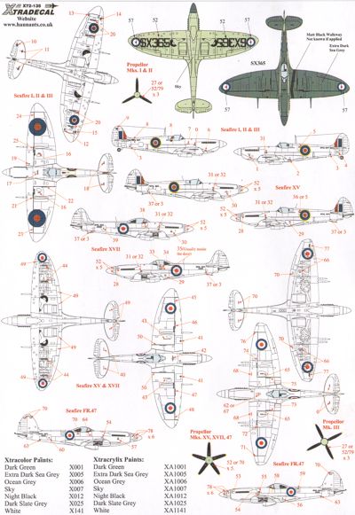 Xtradecal - 1/72 . Supermarine Seafire Mk.II/Mk.III/Mk.XV/Mk.XVII (11) Mk.IIc LR642 8-M 807 NAS HMS Battler 1942, MB249 7-B 880 NAS HMS Indomitable 1943, MB156 O6-G 885 NAS HMS Formidable Operation Torch 1942, Mk.III NN344 K-O 899 NAS HMS Khedive 1944, PP979 D5-X 807 NAS HMS Hunter British Pacific Fleet 1945, NN460 H6-Z 807 NAS HMS Indefatigable 1945, NN621 II-5/N 880 NAS HMS Implacable BPF 1945, Mk.XV SW786 11-4/Y 806NAS HMS Glory 1946, PR494/N 803 NAS R. Canadian Navy HMCS Warrior 1947, Mk.XVII SX365 17-3/JB 736 NAS St.Merryn 1949, FR.47 VP436 141/O 804 NAS HMS Ocean 1947.