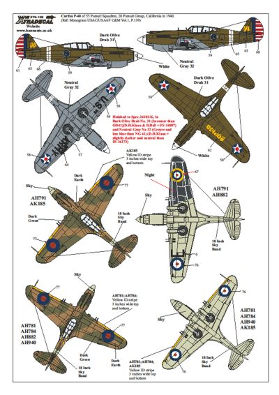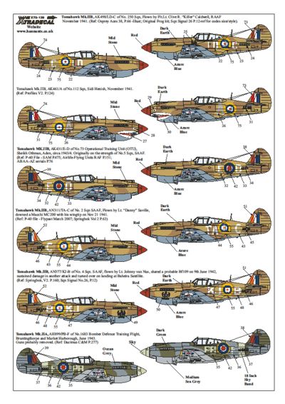 Xtradecal - 1/72 Scale Reprinted. Curtiss P-40B Tomahawk (13) AH179 RM-E 26 Sqn Gatwick 1941; AK185 RU-V 414(RCAF) Sqn Croydon 1941; AH882 KH-A 403(RCAF) Sqn Gatwick 1941; AH784 NM-P 268 Sqn 1941; AH781 SP-S 404(RCAF) Sqn Odiham 1941; AH940 XV-U 2 Sqn. All Dark Green/Dark Earth/Sky. The two Gatwick based had black under port wings for an exercise. AK498 LB-C 250 Sqn Flt Lt Clive Killer Caldwell Raaf 1941; AK461/A 112 Sqn 1941 Shark Mouth; AK431 E-D 77 Otu Aden 1943/44; AN311 TA-C 2 Sqn Saaf Lt Danny Saville downed Mc 200 on 21-11-41; AN377 KJ-B 4 Sqn Saaf Lt Johnny Van Nus probable shared Messerschmitt Bf 109 9-6-42 All North Africa Dark Earth/Stone/Azure Blue; AH899 PB-F 1683 Bombing Defence Training Flt Bruntingthorpe 1943 Dk Green/Ocean Grey/Med Sea Grey; U.S. Army 55 Pursuit Sqn 20 Pursuit Group California 1941 OD/Neutral grey
